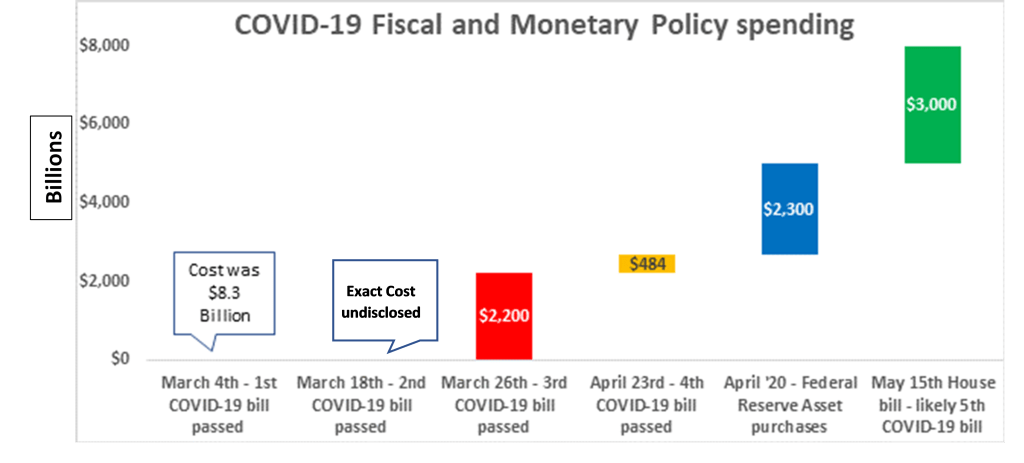 On May 15th the House of Representatives passed a $3 Trillion coronavirus relief bill intended to provide assistance to state and local governments, hazard pay to frontline health care workers, student debt forgiveness and bolster the Medicaid and Medicare health programs. The Senate, interestingly has not yet acted upon this House bill, preferring instead to propose its own new package. This $3 Trillion proposal is expected to be in addition to the $2.2 Trillion rescue and recovery package that the Congress already passed on March 26th to stimulate demand and promote economic growth, the third such measure to deal with the COVID-19 pandemic. Incidentally one month after that initial March 26th recovery package Congress approved another $484 billion coronavirus rescue package on April 23rd that was intended to deliver emergency aid to small businesses and hospitals because well two trillion dollars was just not sufficient. That means between the Executive and Legislative branches–that control fiscal policy–in just a month they had committed nearly $2.7 Trillion to clean up the mess caused by shuttering the economy, and are negotiating to spend another $3 Trillion. But exactly where does the government get all of this money to be spending like that? Do they have it stored up in a vault somewhere just saving for another emergency situation like this? Or are they relying on their good faith and credit to expand our already burgeoning National Debt beyond its already stratospheric $25,481,800,000,000 levels (read that twenty-five Trillion, four hundred eighty-one Billion, eight hundred million dollars) as of noon ET on Memorial Day. [It is important to note that this twenty-five plus Trillion dollar Debt figure significantly understates the true financial obligation of the Federal Government. When we add in the Government’s lifetime obligations to pay Medicare and Social Security benefits to its citizens, and military & civilian retirement commitments to its employees the Truth in Accounting nonprofit organization estimates that the Federal Government’s true financial obligation is closer to one hundred and seventeen Trillion dollars.]